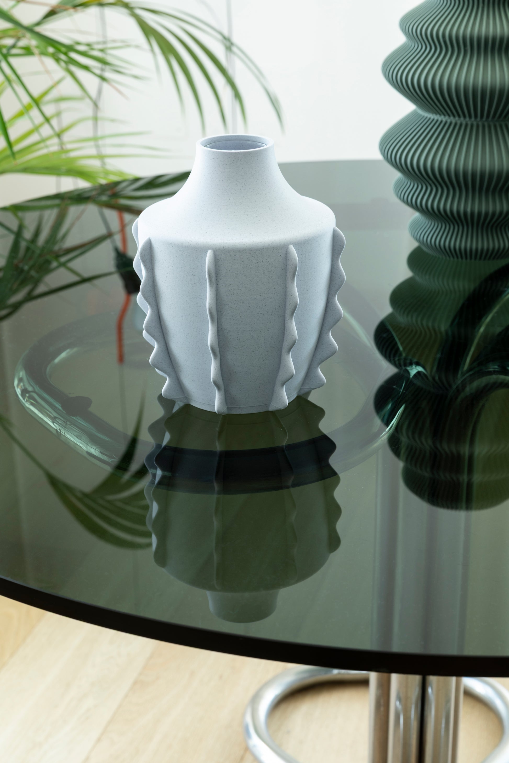 Amphora è un vaso stampato in 3D utilizzando il Pla, una bioplastica di origine naturale ottenuta dalla trasformazione degli zuccheri del mais.