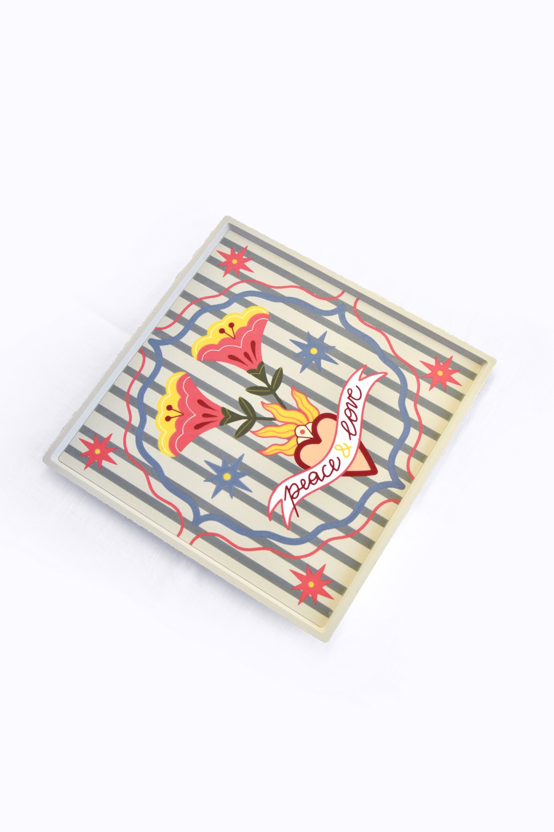 Lo svuotatasche PEACE&LOVE fa parte della serie speciale di oggetti per la casa, frutto della partnership tra Lucille Ninivaggi e Calò. Ogni pezzo è stampato in 3D con il PLA, un polimero bio-based ricavato da risorse naturali.